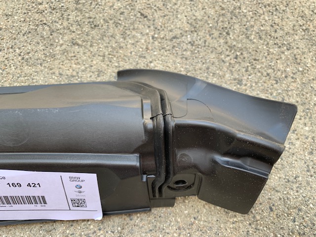 BMW has redesigned the center partition so I bought new one from FCP Euro. I took some detailed pics so you can see how great the new part is. It now has rubber "wings" that will carry water over the gap with the side partition so it won't leak on the engine.