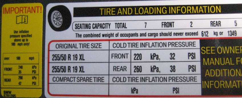 looks like 32/32 normal and unladen and 32/36 with load. Pretty easy and standard stuff. I would guess that 95% of X5 owners are riding around with pressures in that ball park. Surprised that the Stlr didn't balk at your tire rotation request. GL,mD |
