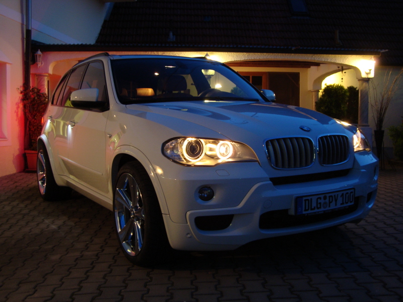 '08 X5 3.0si - Alpine White / Saddle Brown interior Specs: Sport Pkg, Premium Pkg, Tech Pkg, Comfort Access, Aero Kit, Style 433 staggered 20s on Conti DWS Mods: Carbon 35 tint, LED angel eyes, GP Thunder 7500k fogs, H&R 20mm/25mm spacers, clear reflectors, gunsmoke-tinted taillights Coded: Digital speedo, windows/sunroof/tailgate close via keyfob X5 pics at Flickr |