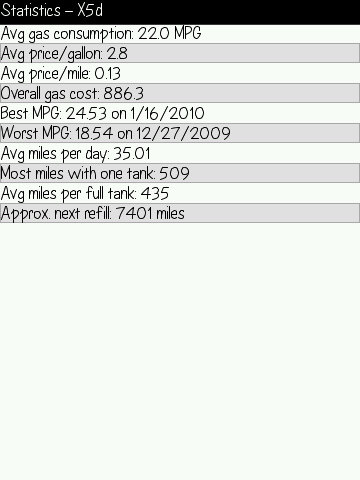 **Added MPG per refill, and over the life of the vehicle: Avg Consumption: 22.02mpg Avg price/gallon: 2.80 Avg price/mile: 0.13 Overall fuel cost: 886.30 Avg miles/day: 35.01 ~~~ I get about 15mpg (based on car computer) in my 535i with Dinan software/exhaust and a very heavy lead foot (I drive very hard in the 5er).