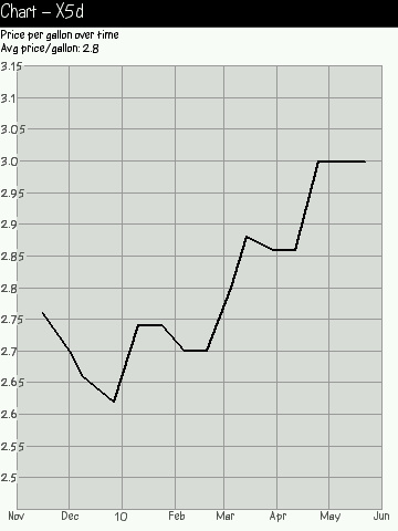 Couple of screenshots from the app on my phone I use to track stats (MileageMeter for Blackberry). The 4 spikes from December to April are my 4 trips up to the mountains - from 5280 elevation (seriously, my house sits at 5280!) to over 11,000 ft at the Eisenhower Tunnel. The car goes up the mountain effortlessly, and down the mountain I'm hardly using any fuel!