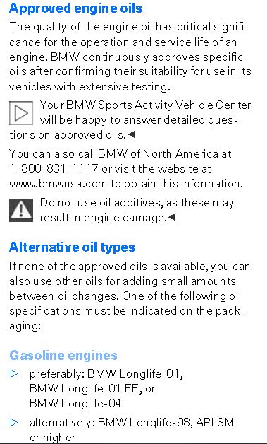 Everything after the text that limits oils to "use for top off" is simply, legally, of zero value in defining what oil should be used to fill the engine. I know it is mind boggling that they choose such convoluted language instead of a "any of these oils are approved" and be done with it...yet they scrupulously retain ONLY "BMW Oil" as the single oil approved for fills. Weird and annoying. |