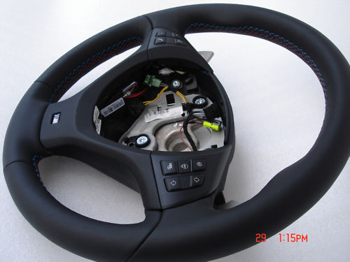 I bought an M-wheel from someone on the forums. It has the traditional M tri-color stitching and has the heating function (which doesn't work as my car doesn't have that).