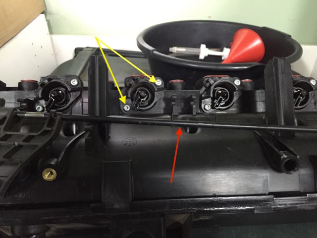 To cut to the chase, I had good news and bad news. The bad news: I had quite a bit of CBU on my EGR valve, intake manifold, and tangential swirl flaps. The good news: The above areas were all relatively easy to clean up. Also, (and I think most importantly) the intake ports and valves were quite clean. I used a Ryobi borescope from Home Depot to get a good look into the intake ports and valves. The top swirl ports had minor to moderate CBU for the first roughly 2 inches or so (the plastic portion of the valve cover). After about 2 inches the plastic valve cover portion converts to metal as the port approaches the intake valve. This metal area had a thin film of oily residue on it, but no CBU at all. I felt confident that the top swirl ports did not warrant aggressive cleaning. The intake valves looked very clean. The tangential ports were nearly pristine (!). Since the intake ports and valves are the hardest to clean (requiring walnut blasting), I choose to think of this as a glass half full situation. Here is a discussion with pics of what I did. For this post, I will only show what I did after I got the intake manifold off. I'll post another thread with how I got the intake manifold off (this site makes it difficult to upload more than 10 pics at once). First a bit of terminology. I believe my terms are correct, but I am a hobbyist - not a BMW tech. I am glad to be corrected if I am wrong. [Edit point: Terms edited on 3/4/15 to conform to later information received from ZetaTre in post #4] To the best of my understanding, air in the intake manifold can enter the cylinders via two different intake ports. The top "swirl port" and intake manifold connection is round and is shown with the red arrow below. The "tangential port" and intake manifold connection is rectangular and is shown with the yellow arrow below. At the intake manifold/tangential port union there is a flap valve that I understand to be termed a "swirl flap." These swirl flaps are controlled by a swirl flap motor, and open/close to varying degrees depending upon a central computer. These will be discussed in greater detail later. But first, here is a pic of my intake manifold removed: Note the round ends will connect to what are termed the top intake "swirl ports." The rectangular ends connect to what are termed "tangential ports." Inside the tangential port area of the intake manifold is the swirl flap. Here is a picture of one of my swirl flaps, with quite a bit of CBU. In order to clean up the swirl flaps, and the intake manifold, it must be disassembled. This is a picture of the underside of the intake manifold: The swirl motor controls the swirl flaps via an actuator rod. First, remove the 2 torx screws at shown by the yellow arrows above. Then the swirl motor will slide out. Then the swirl actuator rod must be carefully pried out from the clips (red arrows above). Be careful - don't break anything. Neither the motor, nor the actuator rod, nor the swirl flaps can be purchased separately. They can only be purchased as part of the entire roughly $800 intake manifold. After removing the actuator rod, things should look like this pic: The red arrow above points to the now released actuator rod. Remove the torx screws shown by the yellow arrows above. Now the swirl flaps are free to be removed. Again - be careful - don't break them! They cannot be purchased separately. So I was very careful to gently remove them with equal pressure on both sides - see pic below: With some gentle and symmetrical pressure, they all slid out easily. Now into a bin for overnight soaking in a degreaser: Sorry I don't have pics after cleanup, but I assure you they were pristine! I removed all the gaskets/rubber washers/retained bolts from the intake manifold and soaked it overnight in a white plastic garbage bin. An industrial degreaser diluted in hot water is what I used. I lined the bin with a garbage bag to make eventual cleanup a bit easier. As you can see, this is not a big deal. It didn't disturb the family dog a bit: The next morning I used a combination of brushes from Home Depot to scrub out the inside of the intake manifold. Sorry - no pics. But I'd say it was 95% clean. As I noted above, the tangential ports were essentially pristine. Here is a pic: I don't have a pic of what the Ryobi borescope revealed of the intake valves (both top swirl port valve and the tangential port valve) - but I didn't think it was worth dealing with a walnut blasting. The swirl ports were a bit more nuanced. Realize that first 2 inches or so of the swirl ports are plastic, and are part of the valve cover assembly. There I had a moderate amount of CBU. Not nearly as much as shown in the first 335d link that I referenced above, but still some. However, after the top swirl port transitioned to metal, all I had was an oily coating - no CBU at all. This pic hopefully shows what I mean: This was perhaps the worst of my top swirl ports. As I hope you can appreciate, there is some CBU initially. But as you look down the intake port, one can see the junction between the plastic valve cover where it transitions to metal. Just below that area one can see a clear streak (where the borescope scraped the oily residue off as I threaded it down to inspect the valve). As one can see, clean metal is just below the oily residue. No appreciable CBU. To clean up the CBU on the plastic portion of the valve cover, I first stuffed a bit of lint free rag down the intake port (to stop debris from getting down to the intake valve). Then I scraped the proximal portion of the intake port with a piece of hard wood formed as a scraper. I wanted to be sure not to damage the plastic of the valve cover portion of the intake port. Then I used a shop vac to suck out the debris that accumulated above the lint free rag "plug" mentioned above. Removed the "plug," and all was well. I replaced the intake manifold gaskets (parts 2 and 3 below). As an aside, one of my tangential port gaskets was beg