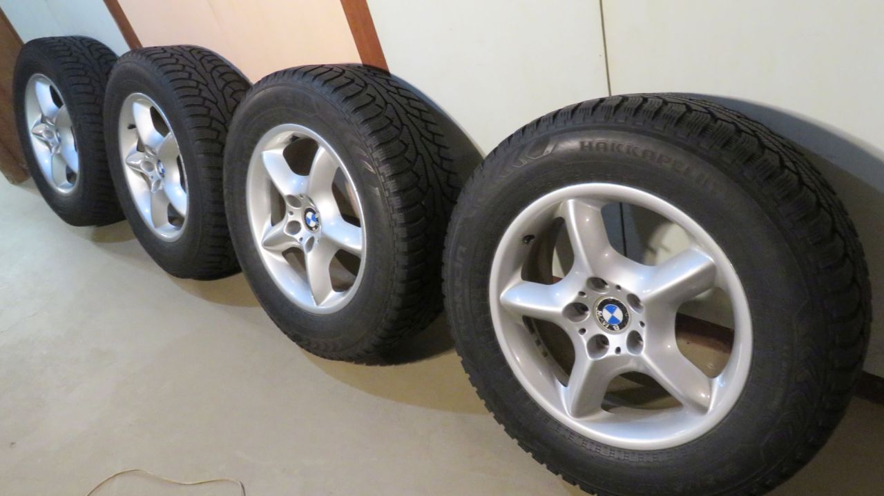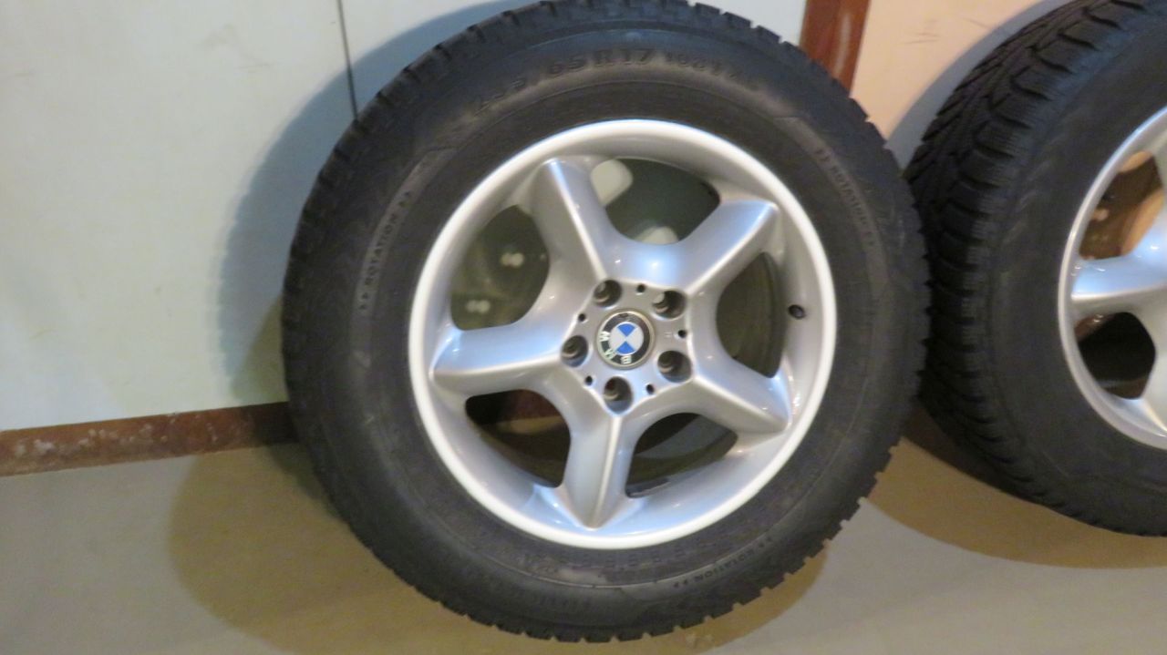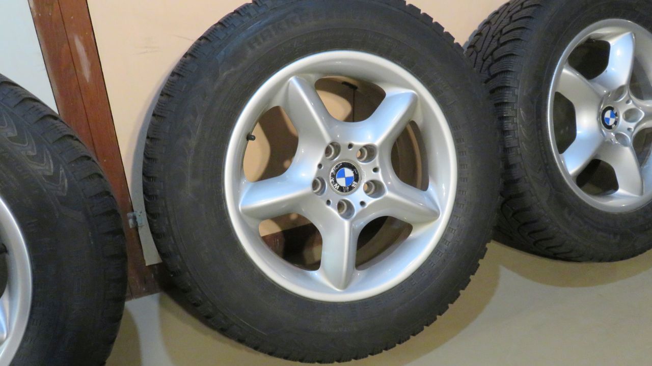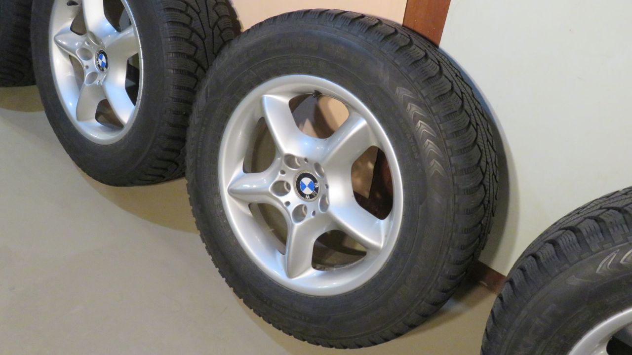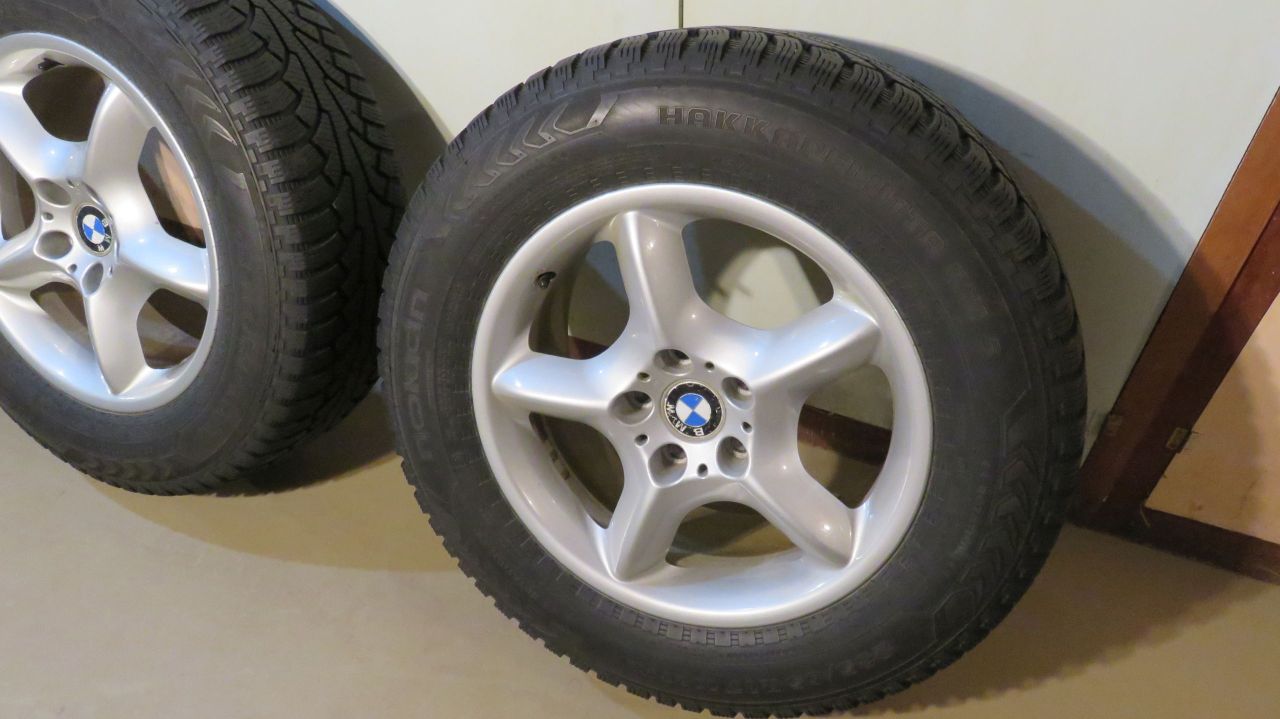 E53 OEM 7.5x17 inch five spoke Style 57 rims all in fine condition w/ no damage. 235/65R17 Nokian Hakkapelitta 5 snow tires, ready for many more miles. $600