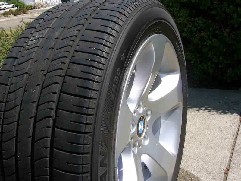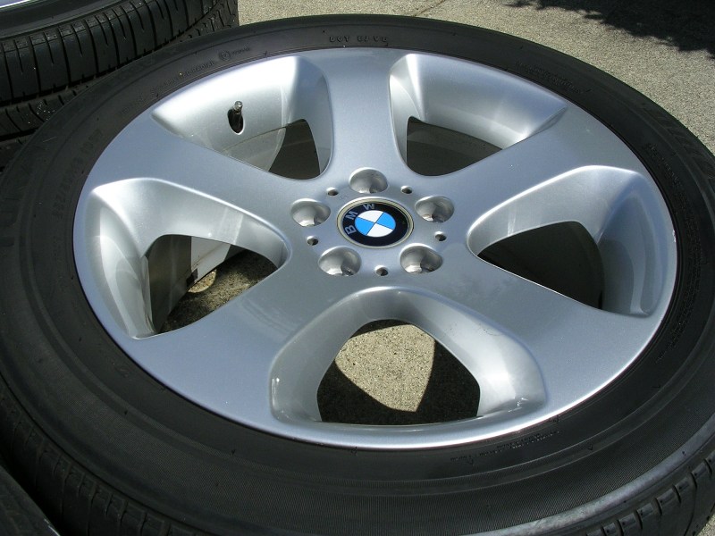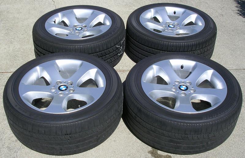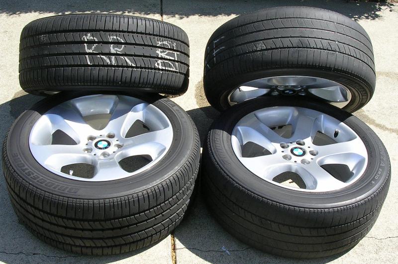 Wheels are in nice condition, set of four; 19x9 front, 19x10 rear. Tires are Bridgestone Turanza; 255/50R19 front, 285/45R19 rear. The front tires are at the wear bars and need to be replaced soon. The rear tires are in good shape and only have 5000 miles on them. Asking $1000.00. Local pick up only, in Redding, California. These are from a 2005 X5 4.4i (E53) will not fit E70 Email [email protected]