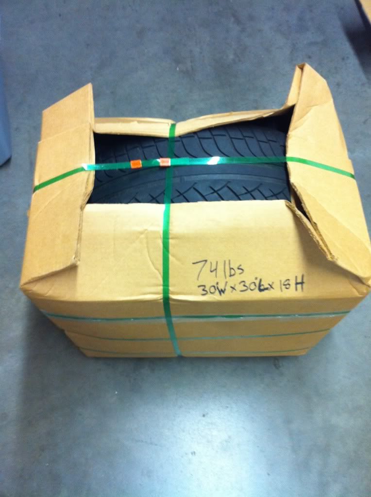 - a zipcode - residential or commercial address to work up a UPS detailed shipping quote that I will scan and send to you. For each wheel/tire, I sandwiched 2" thick foam on either side of the wheel/tire, then sandwiched that with double wall cardboard, then banded the entire thing. I feel that it will ship very safely. (They will ship with insurance though) The weight for each package is 74 lbs, and dimensions are roughly 30"w x 30"l x 18"h Here are pictures of one for example: ![]() ![]()