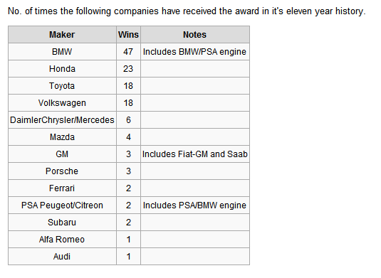 I agree. Nobody even comes close as far as mass-produced engines are concerned. I don't know if this is completely accurate as it is from Wiki, but look at these numbers for International Engine of the Year winners;
