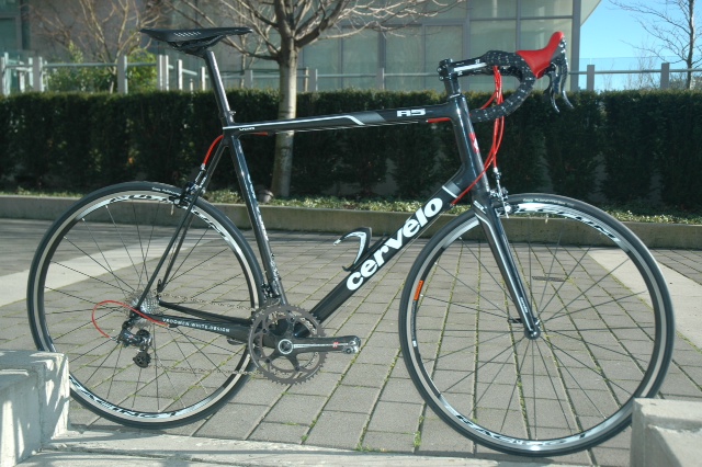 My wife and I got out riding last weekend, it was about 3 C but sunny. Great ride, a little cold when we hit fog half way through but good in the sun. Just over 50 km, a nice way to start the season. Took the Trek and Cervelo R3, the tandem is staying clean for now. I did finally get my new road bike referenced in the posts above. I have been riding a Trek 5200 OCLV carbon for quite a few years, and I put new custom wheels on it last year (DT Swiss rims and spokes, with Shimano hubs) but there was a sale on at the LBS, so..... Presenting the new bike, a 2012 Cervelo R5 VWD. It has the new frame geometry with tapered head tube, BBright bottom bracket, and thin seat stays. 61 cm in my case. Cervelo fork, 3T LTD stem, handlebar, and seat post. Saddle is a fi'zi:k Arione CX Braided. Fulcrum wheels, standard, which I will use for now while I think about lighter wheels. Maybe Fulcrum Racing 1s in a 2-way fit (tubeless/clincher), we'll see. I added Speedplay Zero Stainless pedals, an Elite bottle cage, and got a new pair of Sidi shoes. That means I can leave the Shimano SPD-SL cleats on the old shoes. I have three shoe and cleat combinations now, between the tandem, Trek, and new bike. Biggest decision was to go Campagnolo. They had it available with a full Campy grupo, in this case Super Record 11. Never seen so much carbon and titanium. It was beautiful. Between three bikes I currently have Ultegra, Dura Ace 7800, and my wife has Dura Ace 7900, and they all work great, but this became a lust decision rather than a practical decision. They had the same frame built up with Ultegra 6700, but I decided it was time to try Campy, especially considering that this is a traditional frame (not aero) and so the Campy felt right. I haven't been through the fitting exercise yet, so the steering tube still needs to be cut down, but here it is as I brought it home. Pictures to be attached when the server errors stop. Edit: Seems to be fixed, one low resolution photo attached. Rest to follow