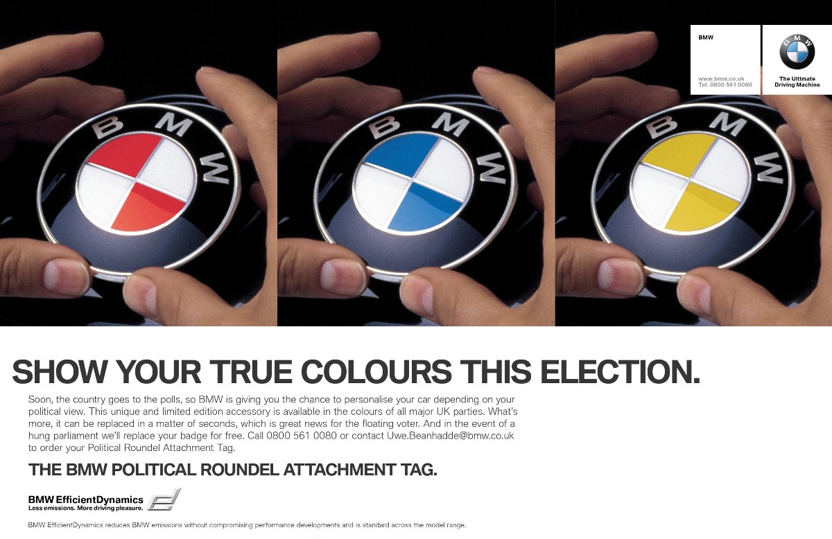 The BMW Political Roundel Attachment Tag * 01.04.2010 * Press Release Soon Great Britain will be in the grip of election fever and as the public goes to the polls BMW has created a unique way for customers to personalise their cars depending on their political leanings. BMW’s innovative Political Roundel Attachment Tag (PRAT) is a highly stylised limited edition accessory of the BMW product portfolio and comes available in the colours of all major UK parties. Uwe Beanhadde, Head of Made-up Technology at BMW’s renowned Forschungs und Innovationszentrum in Munich, said: “We have been working on this innovation for a number of years and see it as a niche with potentially wide appeal. One of the most popular features, sure to strike a cord with the floating voter, is that the roundel can be replaced in a matter of seconds should the opposition suddenly seem more appealing”. News of the PRAT accessory comes swiftly after boffins at BMW offered other award winning innovations such as Canine Repellant Alloy Protection that stopped dogs relieving themselves on customers’ wheels, Magnetic Tow Technology, the ultimate in tailgating tech, and BMW Instant Messaging which let owners know what they really thought of other road users. Further details on PRAT can be found by contacting 0800 561 0080 or emailing [email protected] To find out more on real innovations visit BMW UK: Connected Drive or BMW UK : BMW EfficientDynamics |