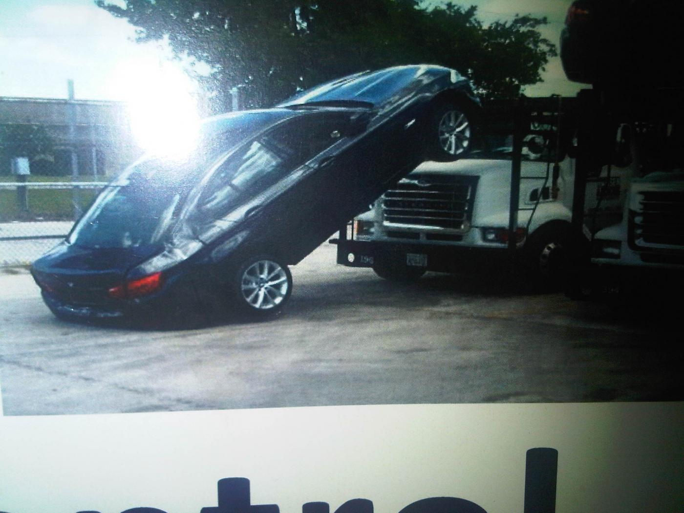 Now I'm curious... was the transport truck guy in the car and backed up off the truck, or was the car not strapped properly and he hit the brakes...?