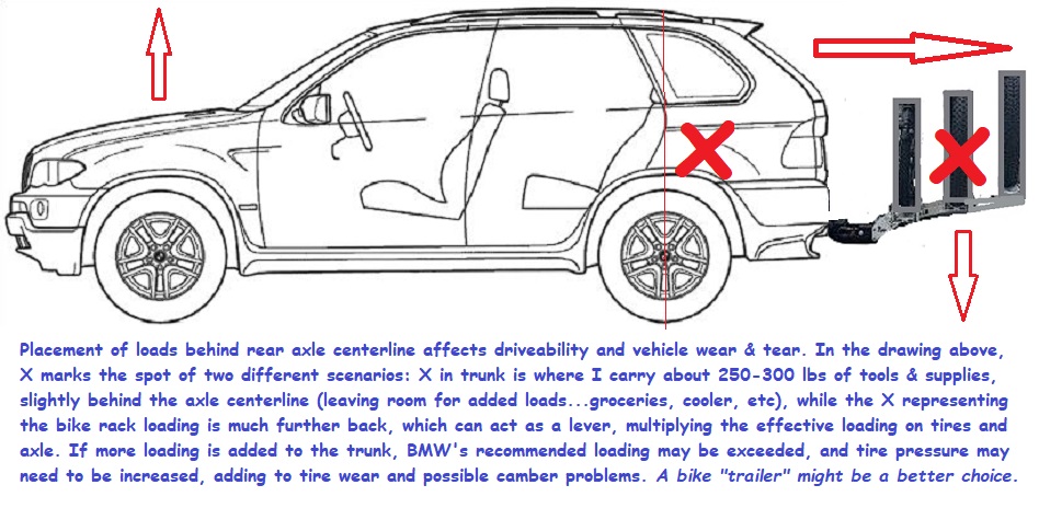PropellerHead, nice X5 (blue is best, IMO, hahaha). I'm concerned about excess loading and the resultant tire & suspension wear that your extended bike carrier may end up causing.