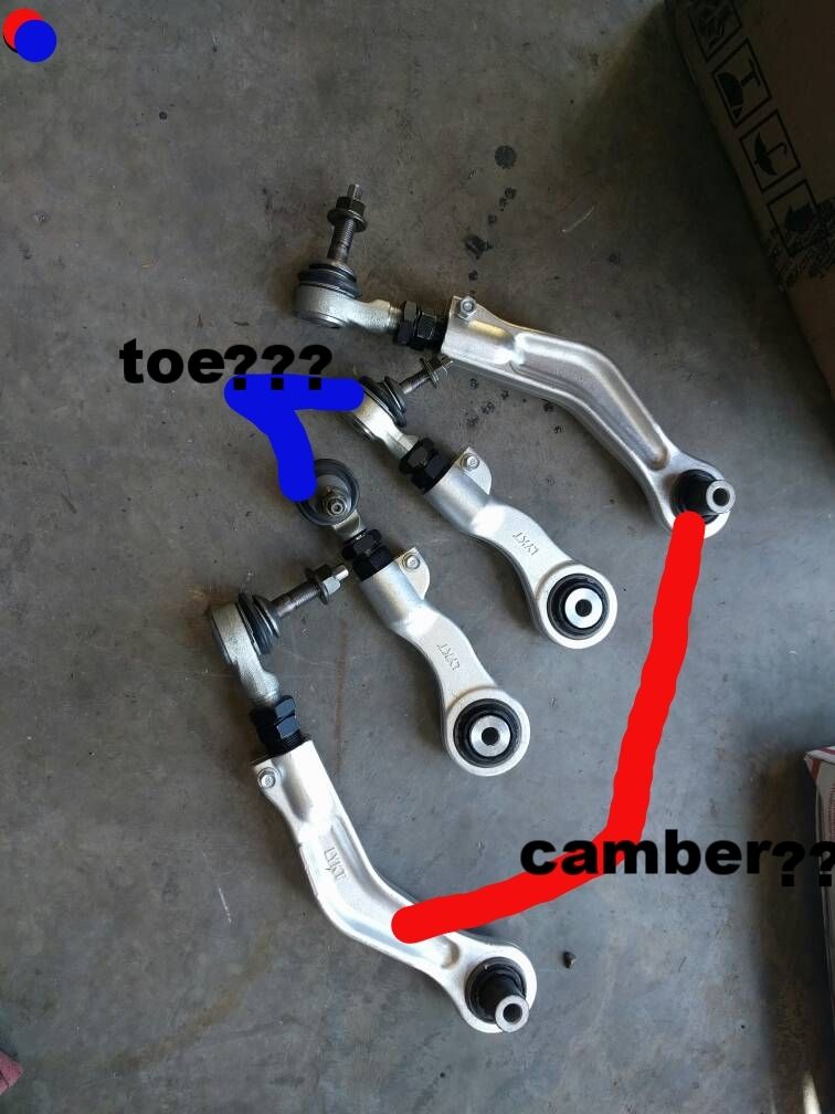 Rear Left camber within spec: -1.9 (range -2.2 / -1.5) Rear Left toe within spec: 0.16 (range 0.07-0.23) Rear Right camber was out of spec: -2.6 (range -2.2 / -1.5) Rear Right toe was in spec: 0.17 (range 0.07-0.23) im not sure what rear cross camber means but that was out of spec at 0.7 (range -0.5 / 0.5) everything else was within normal limits. Im almost at 120k miles and I haven't touched any suspension parts (minus front air bags). Maybe that's all i need is some fresh bushings to get my alignment in spec. alignment guy said there is no adjustment in the rear so it got me thinking about these adjustable arms. |