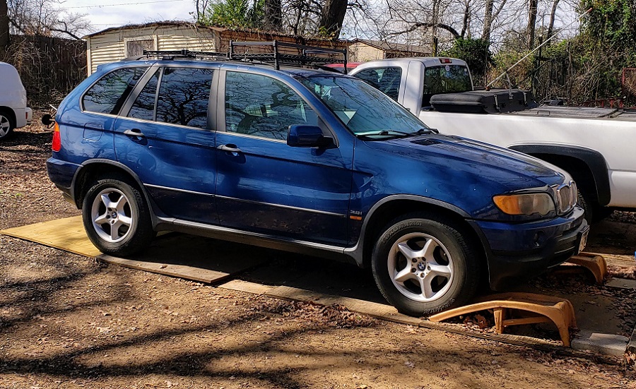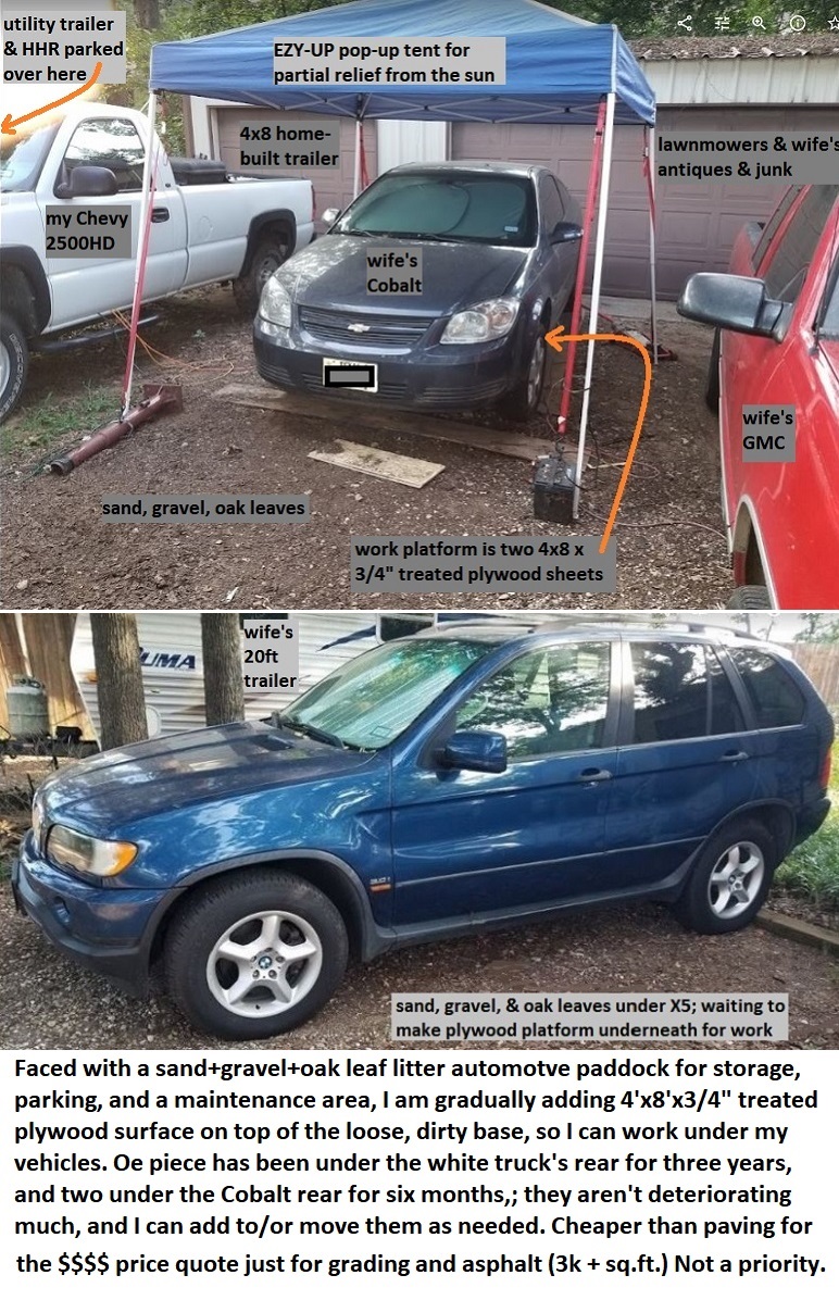 Oh, since that occasion, I sold my engine lift to the neighbor that I got the X5 from, since I knew I'd not likely ever use it inside the garage again. I have a different lift that I used to have mounted in the bed of my '04 Chevy 2500HD (used to lift engines, and generators, when I was building race cars or actually racing), that I could re-mount and use if/when I might need to, but probably won't, as I'm getting too old to be doing that sort of heavy lifting stuff, alone in my driveway. So, since I'm forced to work outside on car projects, on a sandy/gravelly/leaf-strewn driveway/car corral area in front of the garage, behind the house (out of sight from the street), I put down 2.5 sheets of 4'x8', 3/4" thick treated plywood over the sand, secured a 4x4 with rebar to the front of the plywood "work surface", used two flat cinder blocks placed against the 4x4 as a front barrier to keep the steel ramps from sliding forward into the garage, and voila, there's my outdoor workspace. Attachment 85020 the old way I worked outside, circa 2022 Attachment 85021 new "workspace" platform, from 2023 onwards I'll use a 8'x8' pop-up canopy (from my camping gear) if I'll have a multi-day (once a multi-month) project going on, or even for some one-day projects in rain or excessive heat. I had one canopy get destroyed in a major storm, after it was up for months, but since I had two, bought for $50 apiece, it wasn't a big deal. Also, since I'm working outside, and don't want to lose anything, I'll put parts in one box, tools in another (usually puppy pad boxes, since we go thru so many). We've got squirrels, possums, raccoons, semi-feral cats, free-ranging chickens & roosters, sometimes a neighbor's dogs & goats & turkeys, and occasionally his nosy 20-something kid coming into the workspace, so tools and parts MIGHT go missing, if I let them stay outside, unwatched. |