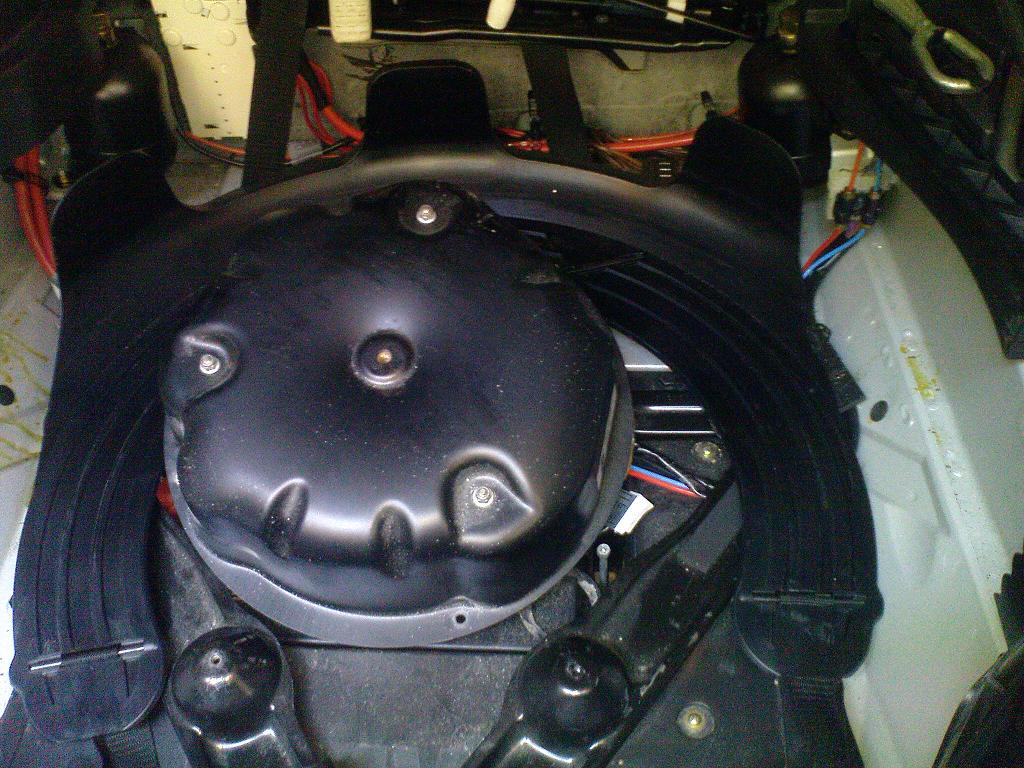 That dome with the wires goint to it is the compressor and valving for your rear air suspension (self leveling). To get to the battery you should leave that bolted to the metal bars and unbolt the bars themselves from the trunk floor. (2 13mm nuts towards rear, 2 13mm bolts at the front corners) Then you just pick it up and lean it back out of the way.