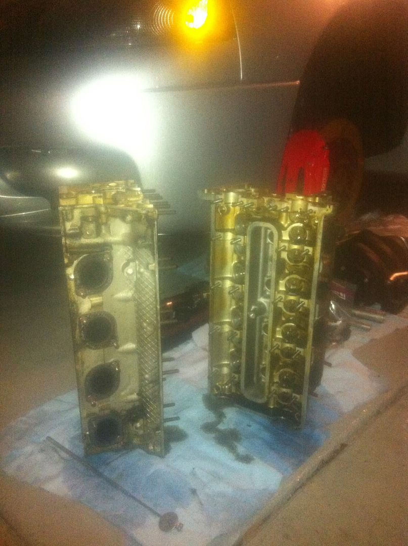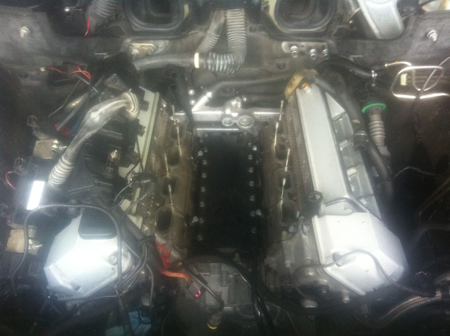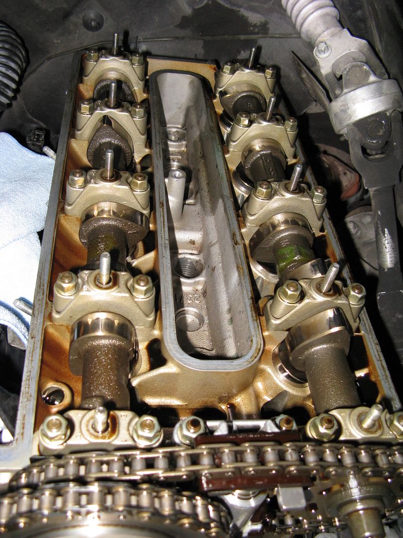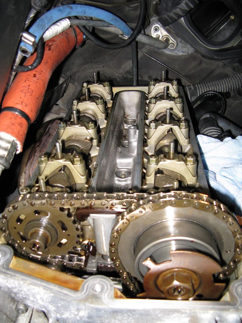 http://img.photobucket.com/albums/v1...M62Valley3.jpg Digging deeper. http://img.photobucket.com/albums/v1...M62Valley4.jpg Left (Driver's) head, valve cover off. Note the intake to exhaust cam mis-alignment. http://img.photobucket.com/albums/v1.../Lefthead1.jpg http://img.photobucket.com/albums/v1.../LeftHead2.jpg Right (Passenger's) head, valve cover off. Note a more severe intake to exhaust cam mis-alignment. http://img.photobucket.com/albums/v1...RightHead1.jpg http://img.photobucket.com/albums/v1...RightHead2.jpg Still, the valves never made friends with the pistons. I imagine a few exhaust valves are mushroomed at the seat, however. http://img.photobucket.com/albums/v1.../M62Heads1.jpg No matter, off they go to BMW heaven aka VAC Motorsports. |